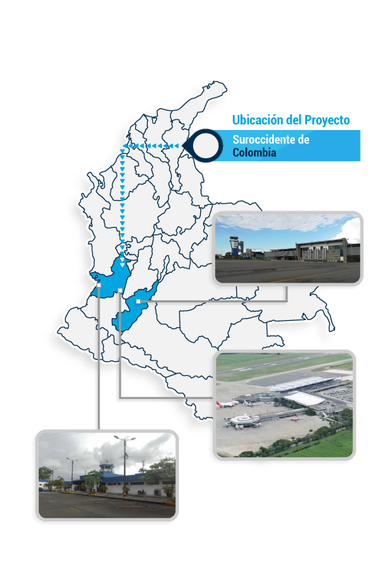 - Se enfoca principalmente en la operación de expansión y mantenimiento para el Aeropuerto Internacional de Alfonso Bonilla Aragón en Cali, así como los Aeropuertos Nacionales de Benito Salas en Neiva y Gerardo Tobar López en Buenaventura.