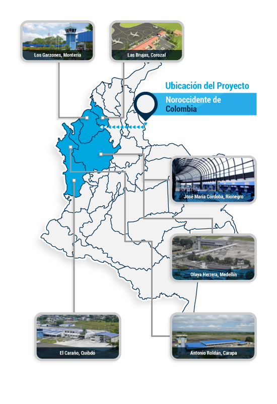 - Consiste en la estructuración financiera, legal y técnica y puesta en marcha del proceso de integración y concesión, de los aeropuertos José María Córdova de Rionegro y Olaya Herrera de Medellín, y el estudio que determine la viabilidad financiera, legal y técnica para incluir en la concesión, los aeropuertos Los Garzones de Montería, El Caraño de Quibdó, Antonio Roldan de Carepa, y Las Brujas de Corozal.